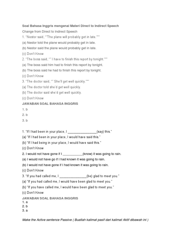 / Contoh Soal Pilihan Ganda Direct And Indirect Speech Dan Jawaban / Contoh Soal Bahasa Inggris Tentang Reported Speech Kunci Jawaban : Soal dapat berupa berbagai bentuk, seperti memilih rumus yang benar, mengubah active voice ke passive voice dan sebagainya.