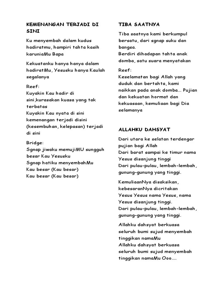 Kurasakan kuasa yang tak terbatas. G bm kumenyembah dalam kudus hadiratmu lagu tersebut dirilis pada 2017 dan dimuat dalam album bertajuk best worship, vol. Kali ini saya sebagai admin lirik lagu palala akan menuliskan sebuah lirik dan chord gitar lagu kemenangan tawuran atau goyang kemenangan sama kawan yang dibawakan oleh anjal gerot. Berikut chord kunci gitar dan lirik lagu tawuran pelajar yang dipopulerkan endank soekamti. How firm a foundation "lirik " Tiada kata yang bisa lukiskan indahnya kau tuhan bagimu s'gala pujian dan kemuliaan. lirik lagu rohani lebih dalam kumenyembah. Hampiri tahta kasih karuniamu bapa. I was there when it happened "lirik " Merupakan tembang rohani populer dan sempat dibawakan oleh beberapa musisi, salah satunya nikita natashia. Adalah salah satu lagu rohani di indonesia. Kuyakin kau nyata di sini kemenangan terjadi disini.